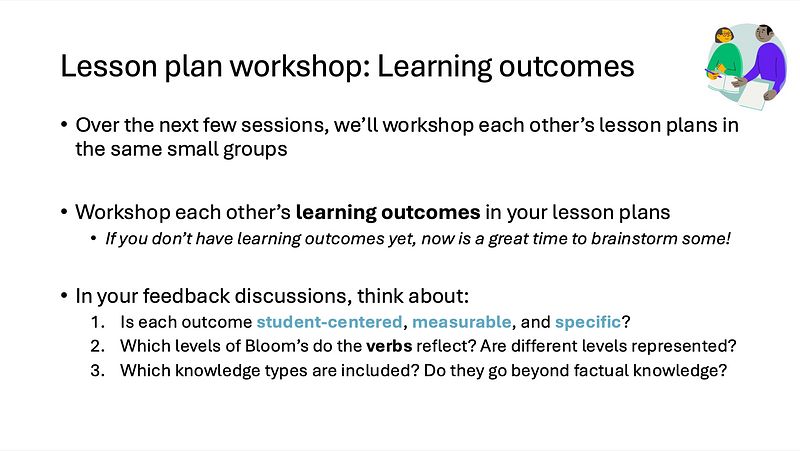 Multi-session peer review activity to workshop a lesson plan draft. Students revised each other's learning outcomes after learning about Bloom's taxonomy.
