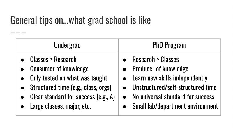 A table highlighting the differences between undergrad and a PhD program